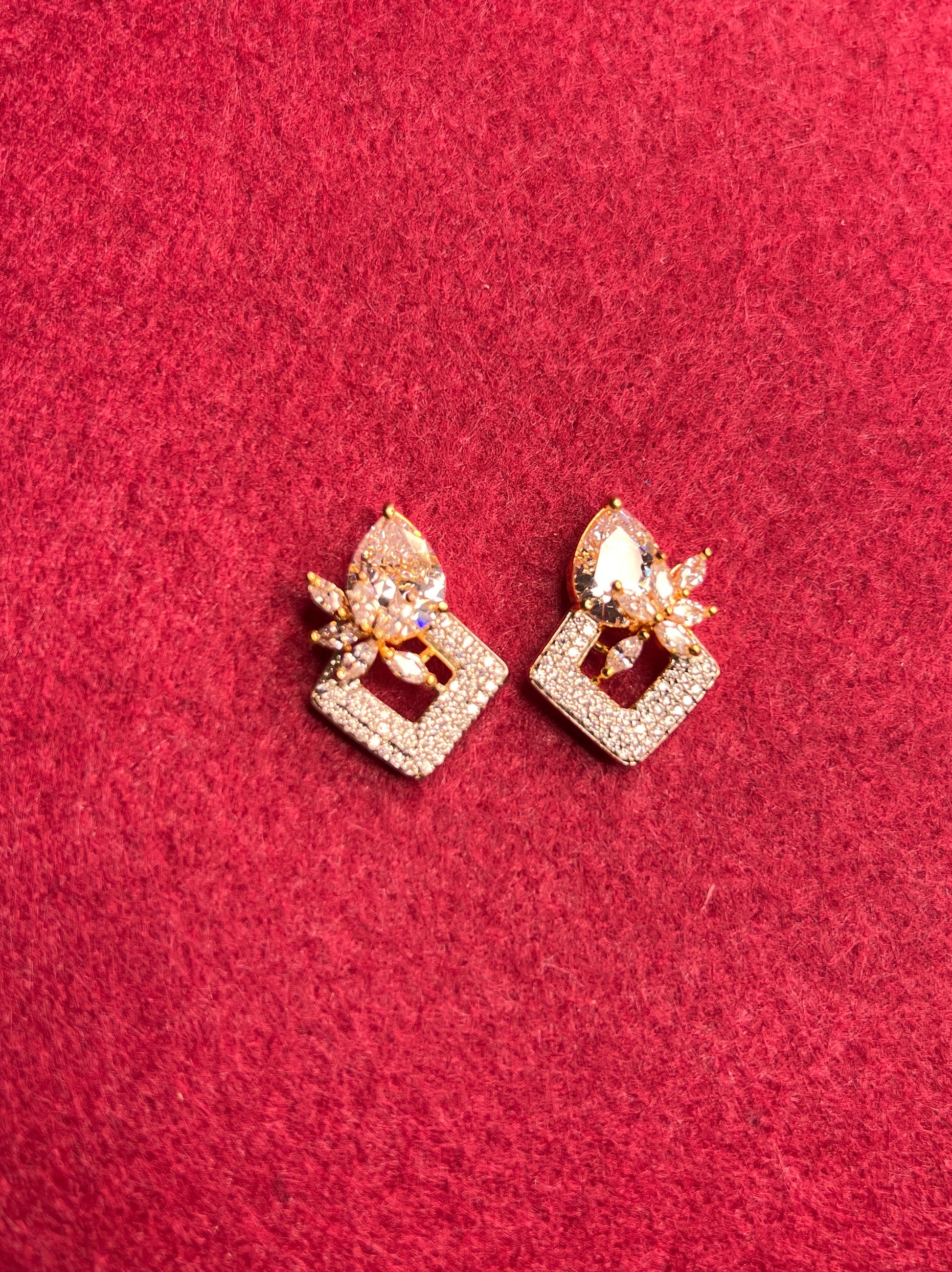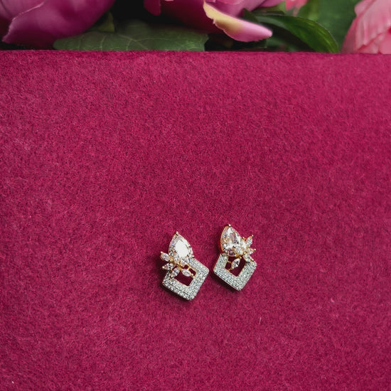 The Aarvika earrings feature a unique design with pear-shaped and marquise-cut stones, set in a delicate floral motif atop a geometric square base. These earrings are perfect for adding a touch of elegance and modern sophistication to any ensemble.
